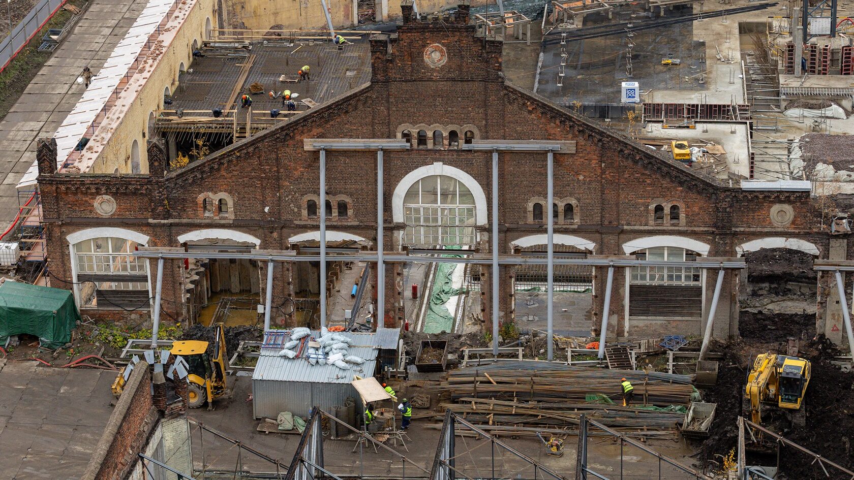 На территории исторического здания уже полностью откопан котлован, полным ходом ведутся бетонные работы, а реставраторы бережно укрепляют и очищают кирпичные стены.